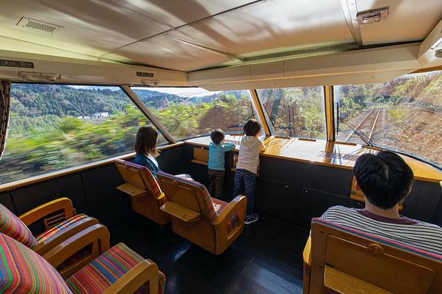 透过巨大的车窗可以领略阿苏壮观的自然美景,而车头车尾(1号车厢、4号车厢)设置了可以全面观赏阿苏风景的全景坐席。