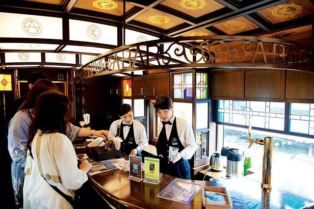“坐A列车去吧”的1号车厢设有吧台,可以品尝到鸡尾酒。啜饮熊本县原产丑橘(凸顶柑)风味的 HIGH BALL(高球),微醺下惬意欣赏窗外有明海的美景。