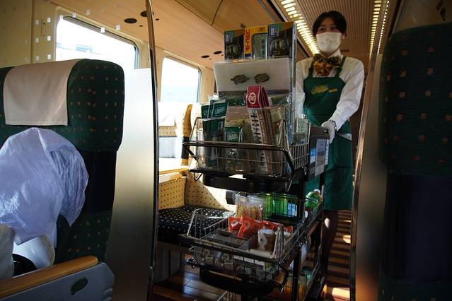 车厢内供应黑芝麻布丁和指宿温泉汽水等轻食。