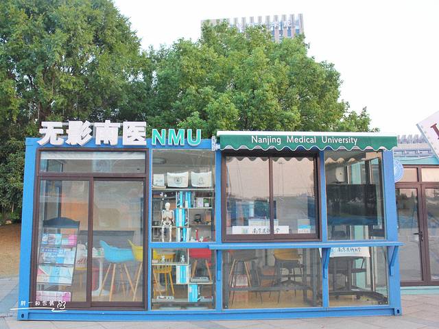 与江宁高新区大学生服务中心对应的,便是广场的东面,拥有关于各家大学的装置。南京医科大学的“无影南医”小屋,标语“我爱金科”,南京传媒学院的动画小屋,写着“南旅印象,遇见南传”。这里还是大学生演播厅,有一个集装箱上着郁郁葱葱的绿色。