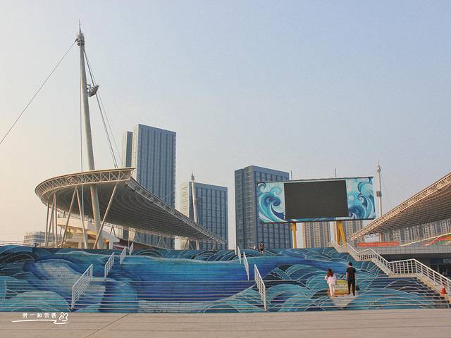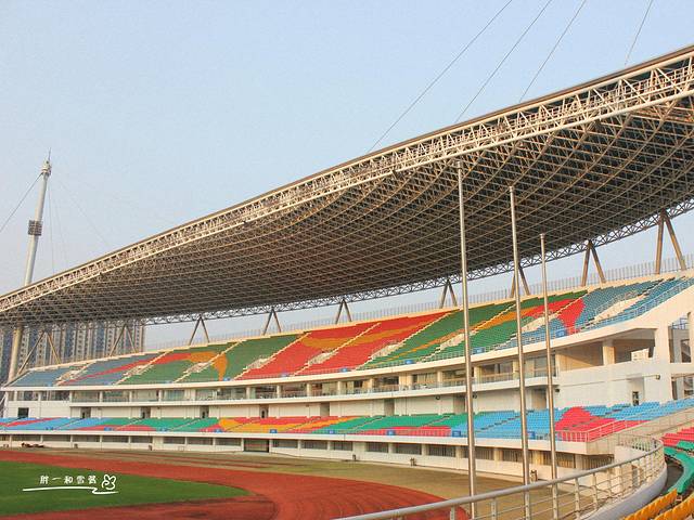 北面一座高耸入天的建筑,便是江宁体育中心体育场,蓝色的涂鸦石阶一路指引着我们,红、黄、绿、蓝四色座椅,一派朝气青春的气息。老人、小孩、青年,或结伴,或一人,骑车的,徒步的,休闲的,玩耍的。