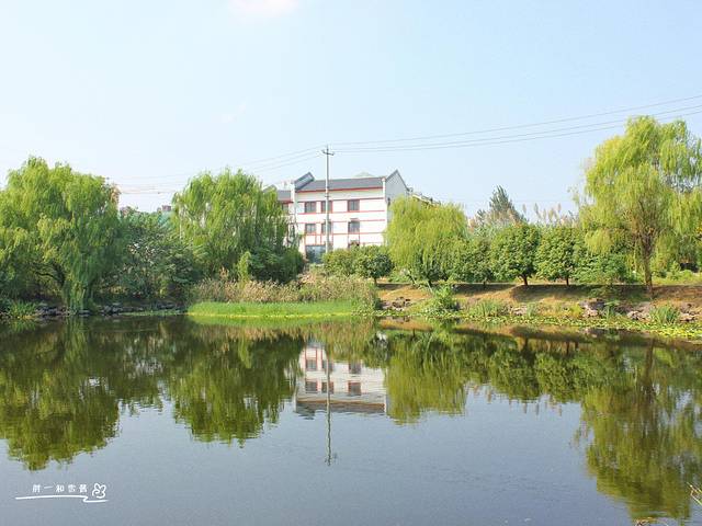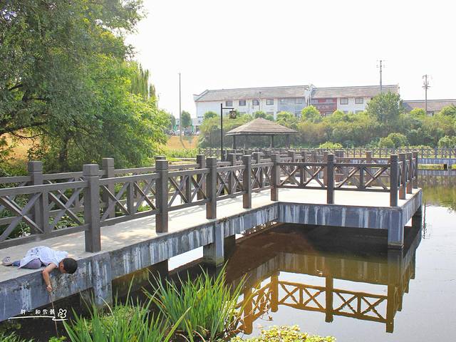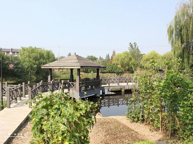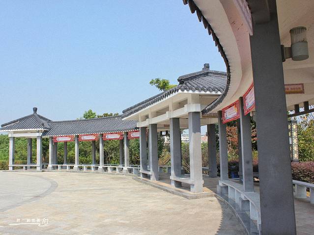 广场东面有一长亭,歇脚纳凉的好去处,亭子后方有青砖铺陈的小路,两旁疏影丛丛,禁不住走进,这才发现是九曲环绕长廊。此处长廊经过之处,水域已经干涸,但见另一处长廊直通水榭,柳树依依,荷叶苍翠。