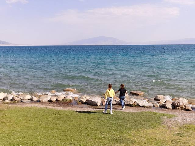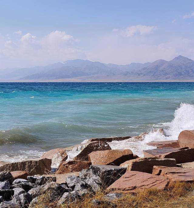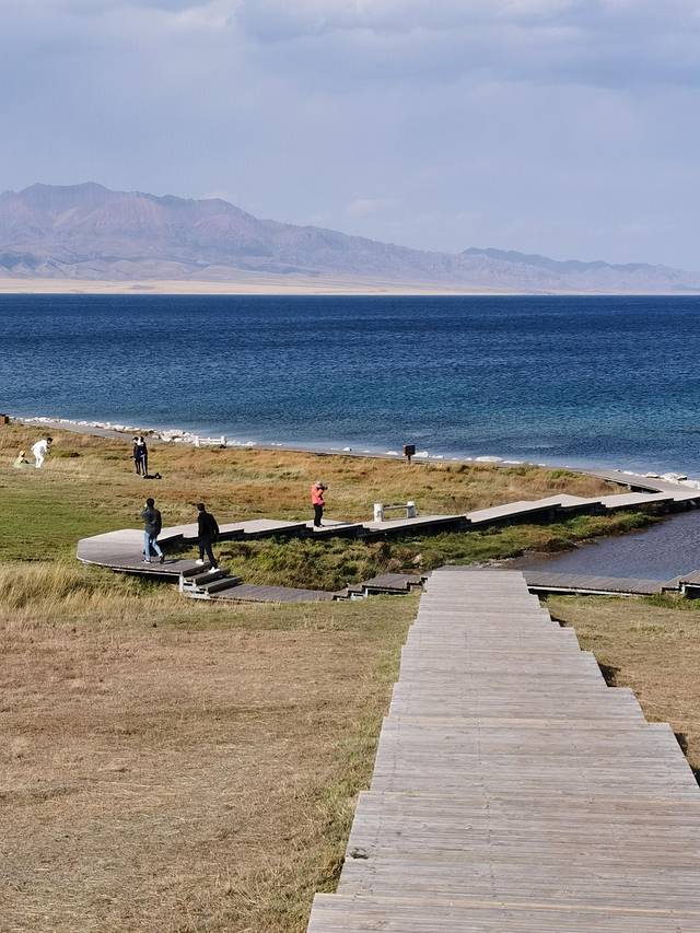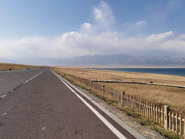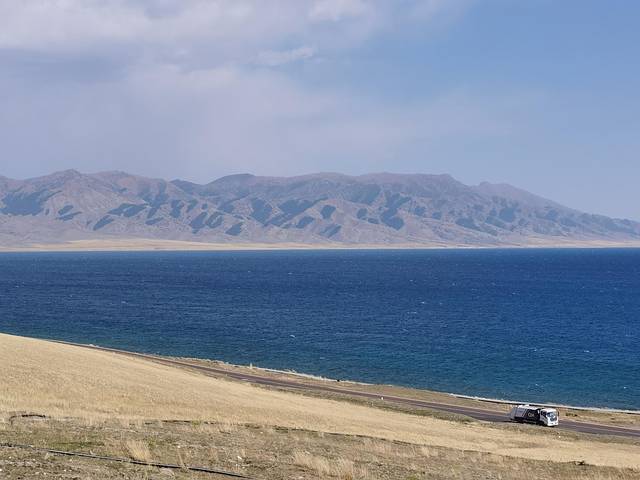 从克拉玛依到博尔塔拉州博乐市的赛里木湖主要走高速公路,奎阿高速、连霍高速,行程约470km。进入景区前先做核酸检测。保存好开具的小条子,以备后续检查。赛里木湖是不需要乘坐景交车的景区,自己的车子可以开进去绕湖游玩。早闻赛湖大名,今日亲临湖畔还是让大家惊奇又兴奋。没到观景台大家就请求停车拍照。由绿到蓝的湖水,绿得青翠;蓝得晶莹。迎风面浪涌拍岸;背风面水平如镜。这是进入新疆以来第一个让我不愿离去的景区。