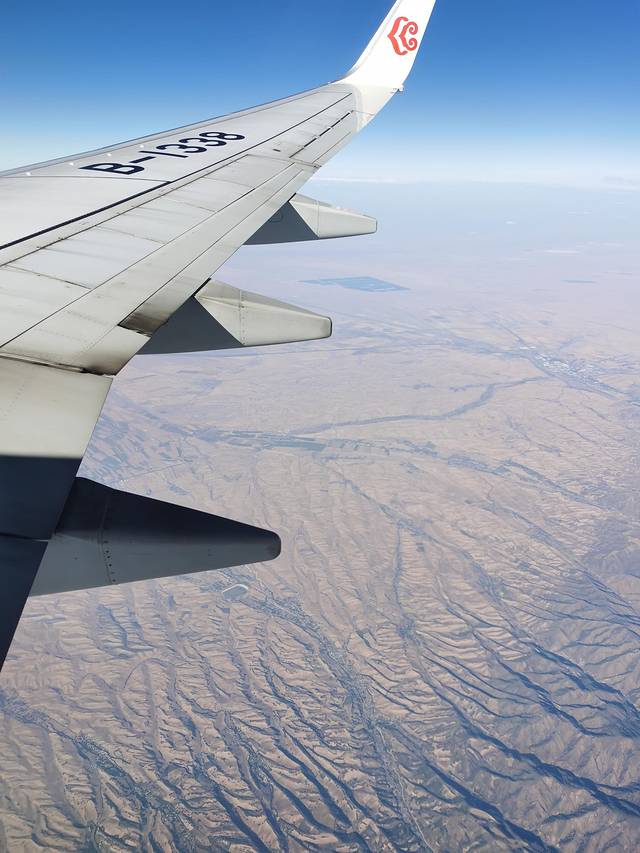 奥凯航空天津到乌鲁木齐的航班,中间在银川经停下飞机休息,所以没有觉得太累。从万米高空向下俯瞰,感觉很奇妙。