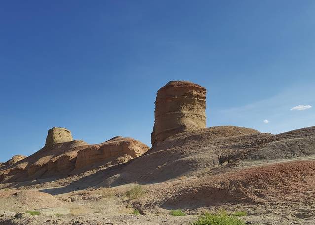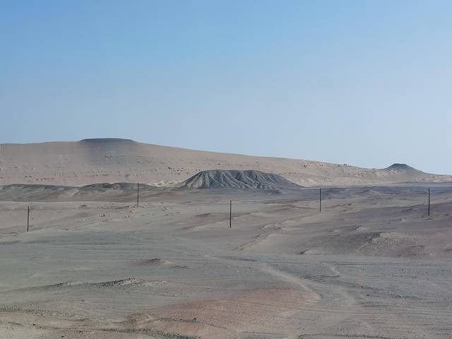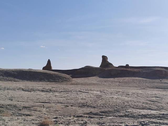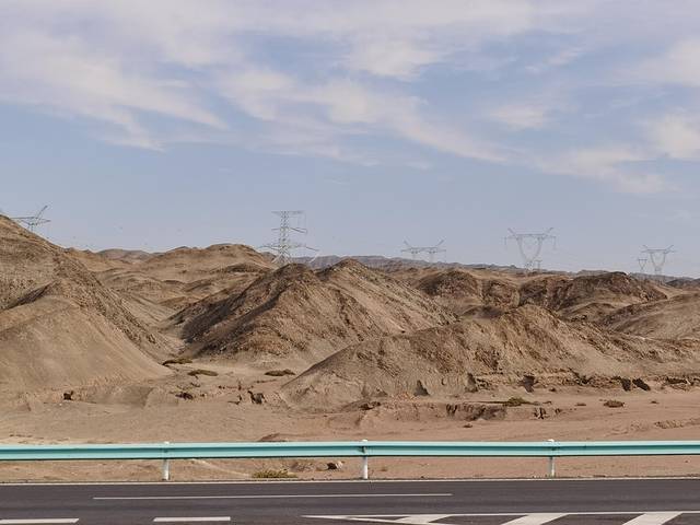 从天池下来,由南向北穿过准噶尔盆地,行程470km,晚上9点多到达富蕴县城。一路上开始看到的土地远处有树木形成的边界,少量的磕头机。后来道路两旁除了无边的砂砾什么都没有,偶有红色的小丘,导游说是火烧山。只有在吉木萨尔县的淮东煤矿附近才看到生机。阿尔泰山在右边远远一路陪伴。