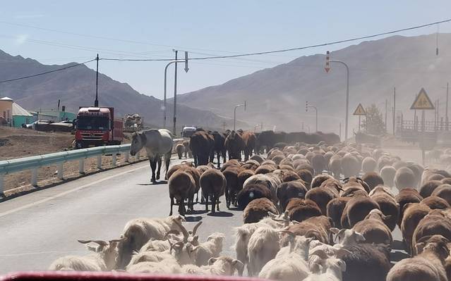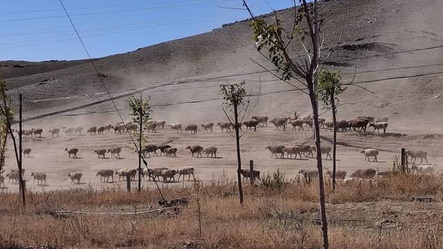 早晨我们在公路上看到路边山沟里尘土飞扬,大家很奇怪,司机师傅告诉我们那是牲畜在转场。离开可可托海,在可可苏里停车拍照,此时恰好遇到哈萨克牧民转场,成群的牛羊在山坡上奔跑,卷起漫漫尘土,那阵势蔚为壮观。