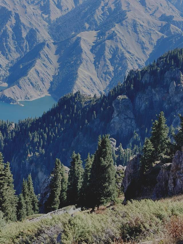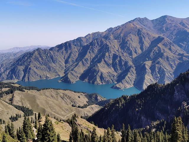 早晨8点20分接下来将陪伴我们全部预订行程的旅游车到了,中型商务车5名游客加1名导游挺宽敞舒适。大约1个半小时到达位于昌吉回族自治州阜康市的天山天池景区。天池不大,拍了几张照片,我们坐缆车上马牙山,那里有观景台可以从高处看到天池和博格达峰,能见度好的天气甚至可以看到乌鲁木齐市。如果不去马牙山,天池太小太单一,没有什么可游览的。在天池遇到旅游专列的游客,他们在天池打卡后就走了。