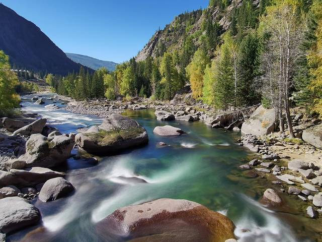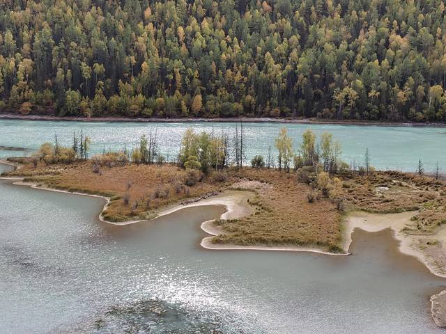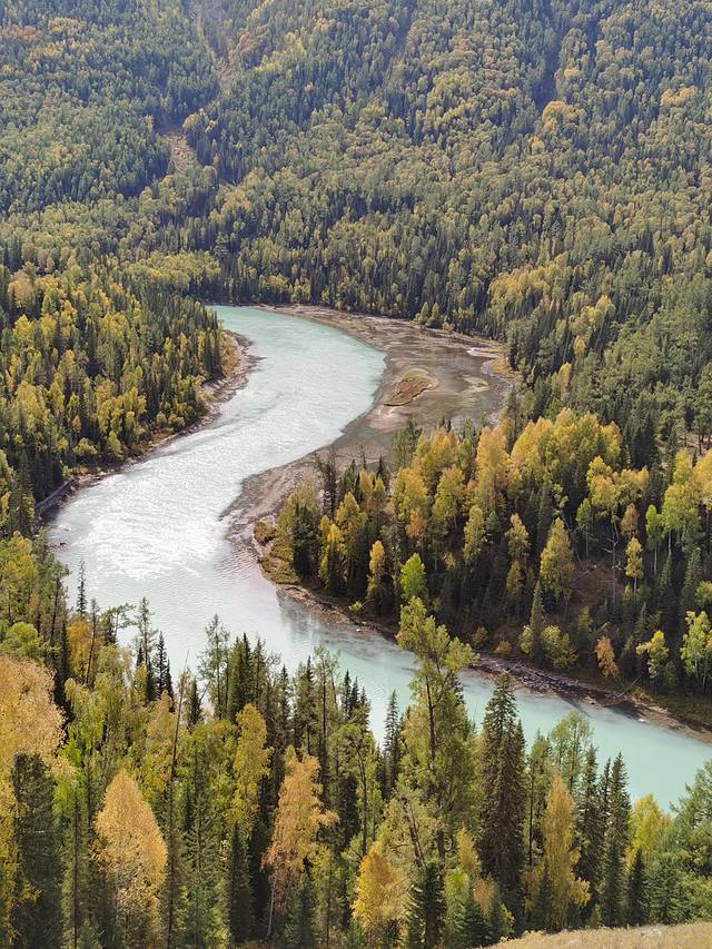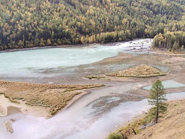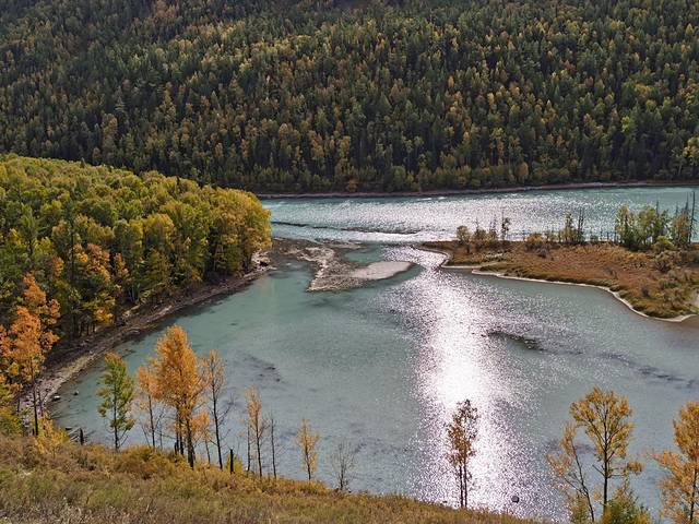 喀纳斯的树种主要有西伯利亚云杉、白桦和少量欧洲山杨。云杉是绿色,白桦大部分是黄色,欧洲山杨的顶尖红了,河水是玉石般的蓝色,缤纷的色彩构成秋天喀纳斯最撩人的画卷。