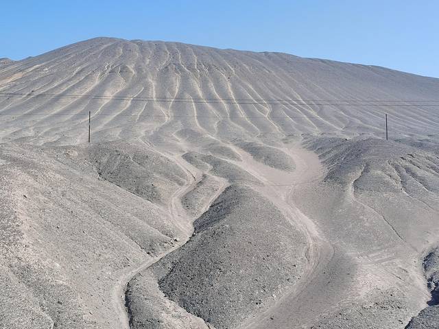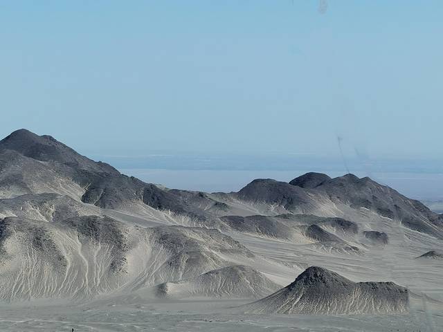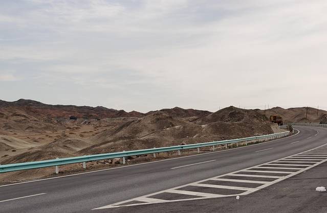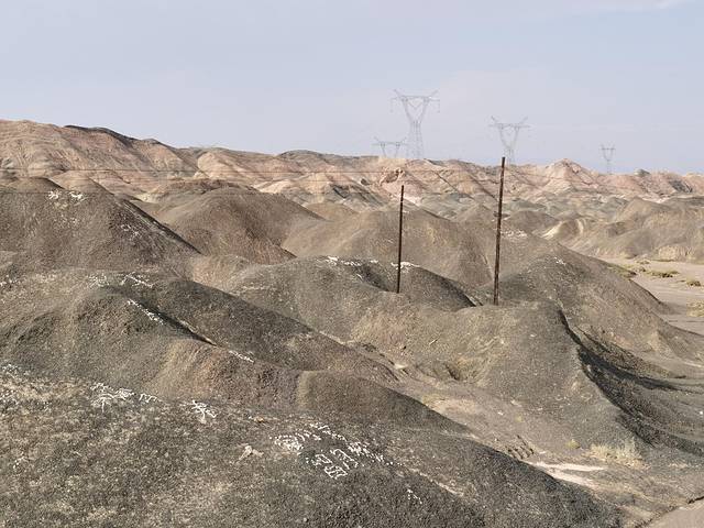 今天虽然没有游览葡萄沟和坎儿井,却有意外收获。车子翻越天山途中,经过干沟,从地名就可以看出这里有多么干燥。连绵的山丘颜色和形状呈多样性,类似于张掖七彩丹霞地貌,只是不如那边鲜艳夺目。有人用白色的石子在小丘上摆出姓名或心形。特别是快到吐鲁番时,大风吹来的沙子像丝绸一样铺在山坡,山脊的曲线柔软细腻,别是一番风景。不知为何摄影师们不到这里来拍摄,绝对是出大片的地方。从托克逊到吐鲁番是一路向下,尤其是出了天山,来到平原,可以远远看到吐鲁番城市轮廓的时候,用天津人的话说,感觉就是往下出溜。从吐鲁番到乌鲁木齐要翻越天山,这里在打隧道,隧道修好后路程会大大缩短。