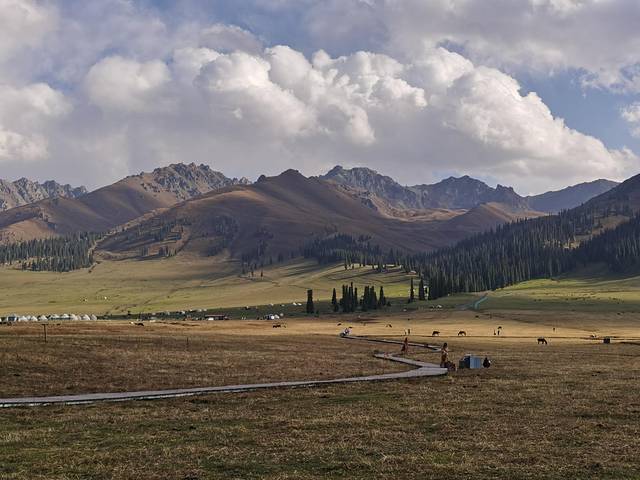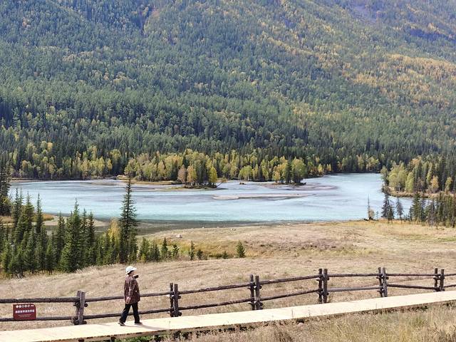 喀纳斯是值得住下来慢慢游赏的,从神龙湾到换乘中心有木栈道可以徒步,换乘中心有餐饮,喀纳斯老村有民宿。周围的贾登峪、禾木、白哈巴(禾木、白哈巴都是图瓦人的村子,可任选其一)也都值得住下来一游。有兴趣的话可以到喀纳斯售票处了解,门票有效期为两天,全域通票有效期为三天。有一个好消息——乌鲁木齐到喀纳斯的高速公路正在修建,建好之后4个小时可以从乌鲁木齐抵达喀纳斯。