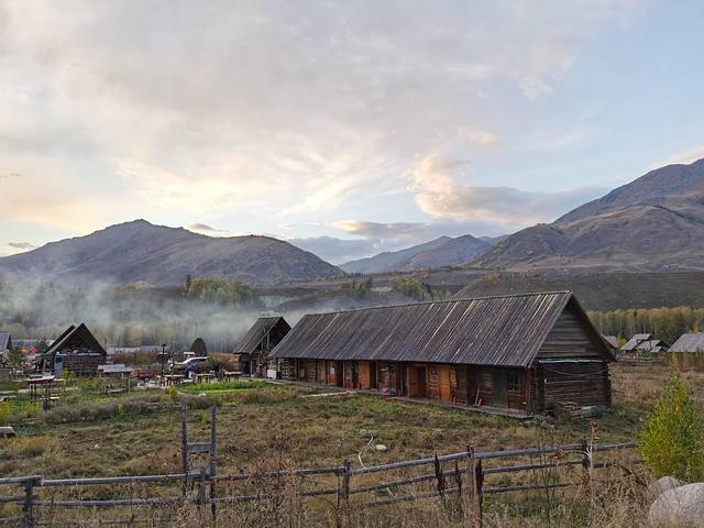 为了看到晨曦中的禾木村,我们天不亮就起床,到民宿附近的观景台等待日出。很不巧的是,那天东边有云,看不到日出。逐渐放亮的天空中有彩霞,晨曦中有炊烟升起。这并不是真正做饭的炊烟,而是专门为晨起的摄影人放的烟。因为要赶路,我们不能在太阳升起后1小时内好好拍几张照片,而是匆匆离开。禾木,看上去那么素雅、艺术的村名,真实的意思是熊背上的肥油——怎么样,够油腻吧!