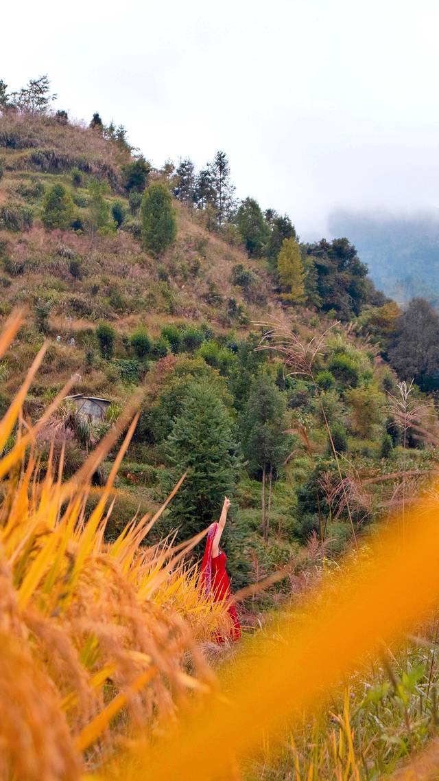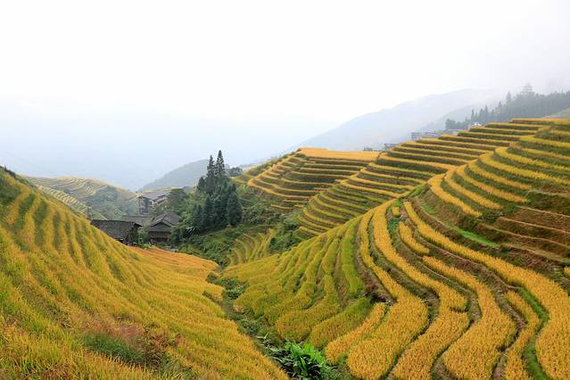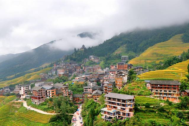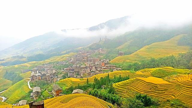 平安最特色的应该是住房吧,都是统一在一处,群居更明显,一座座特色吊脚楼,背景除了金黄的稻谷还有大山,雾气随风扑面而来,渐渐的覆盖整个村落和梯田