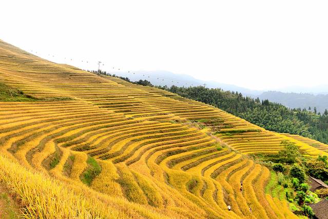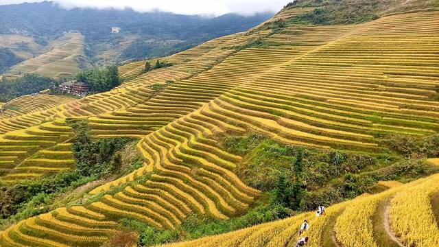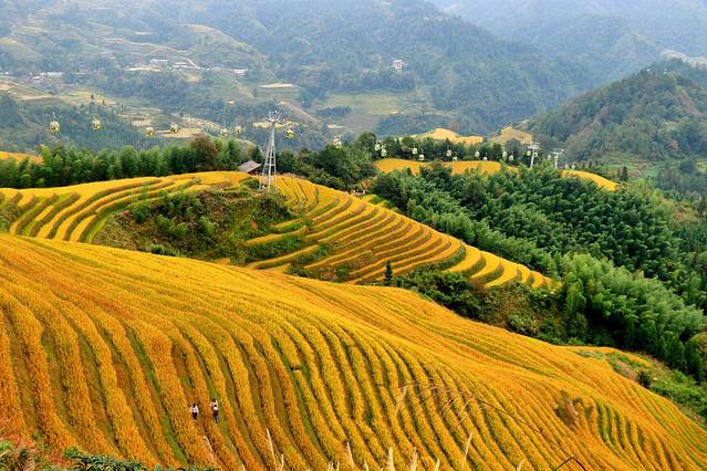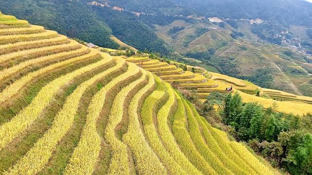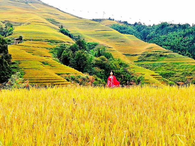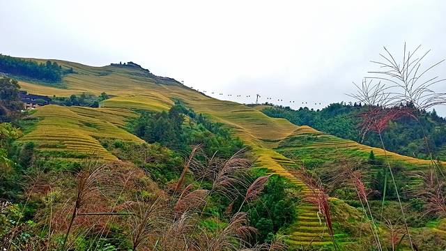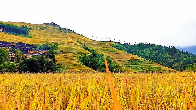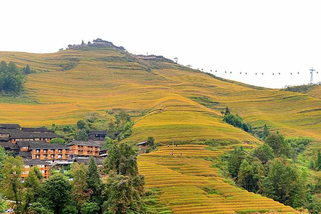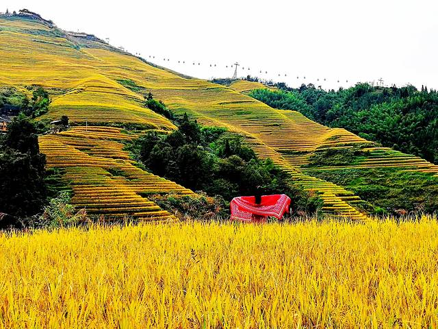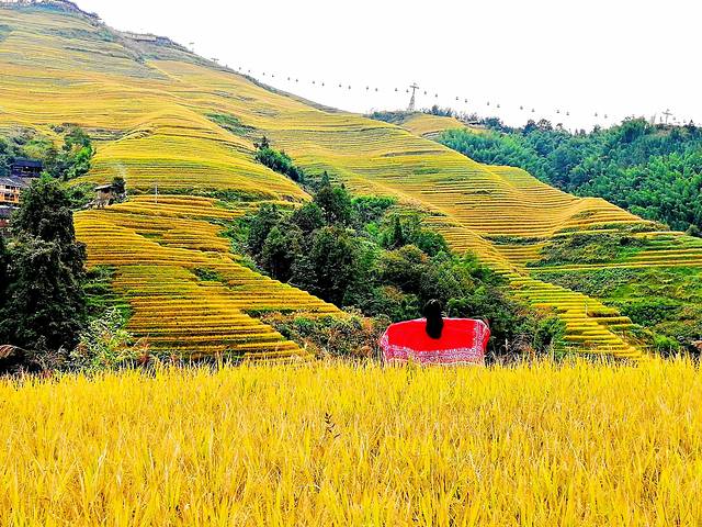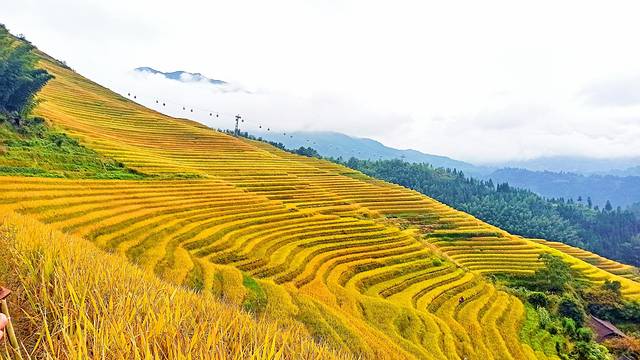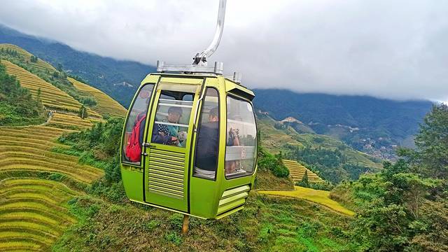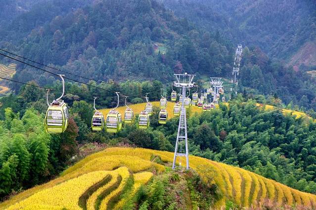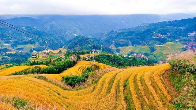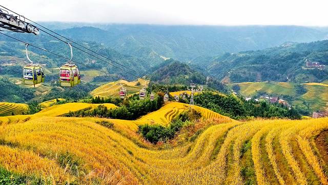一层又一层的金黄色稻谷,在这金秋的季节,不但粮仓满满,观赏性也极高。坐上索道只需20分钟便可饱览龙脊梯田全貌以及沿途美景。金坑梯田观光索道为单线循环四人吊厢式索道,全长1380米、落差310米,设有吊厢113个。