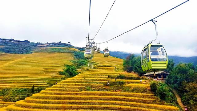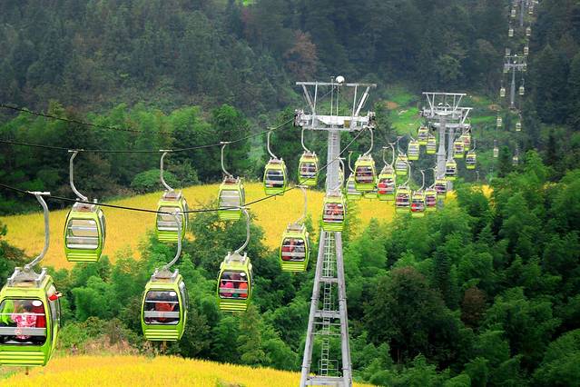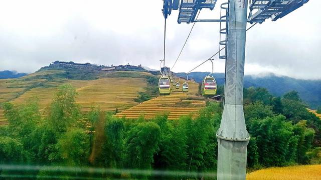 缆车一点点往上升,沿途的风景很美,只是在上下缆车的时候速度要快一些哟,缆车的运行速度偏快,黄黄的稻谷,意味着满满的收获,他们说来看田会被笑话的,我们90后可没有田,不怕笑话!
