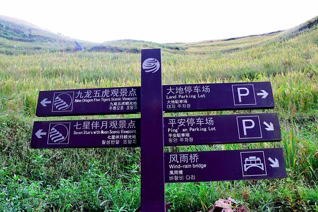 平安梯田集中在平安寨,有七星伴月和九龙五虎两个景点和附近的龙脊古村,金坑梯田——平安梯田,不堵车的情况下约30-40分钟,但是遗憾的是我们堵车啦,不过问题不大,走走停停也到了平安梯田门口,停车场到九龙五虎观景台步行约40分钟(走的最右边的路,一共是三条路,其中中间那条是最陡最快的),九龙五虎观景台——七星伴月约10分钟路程,下山走的中间路段约20分钟-30分钟
