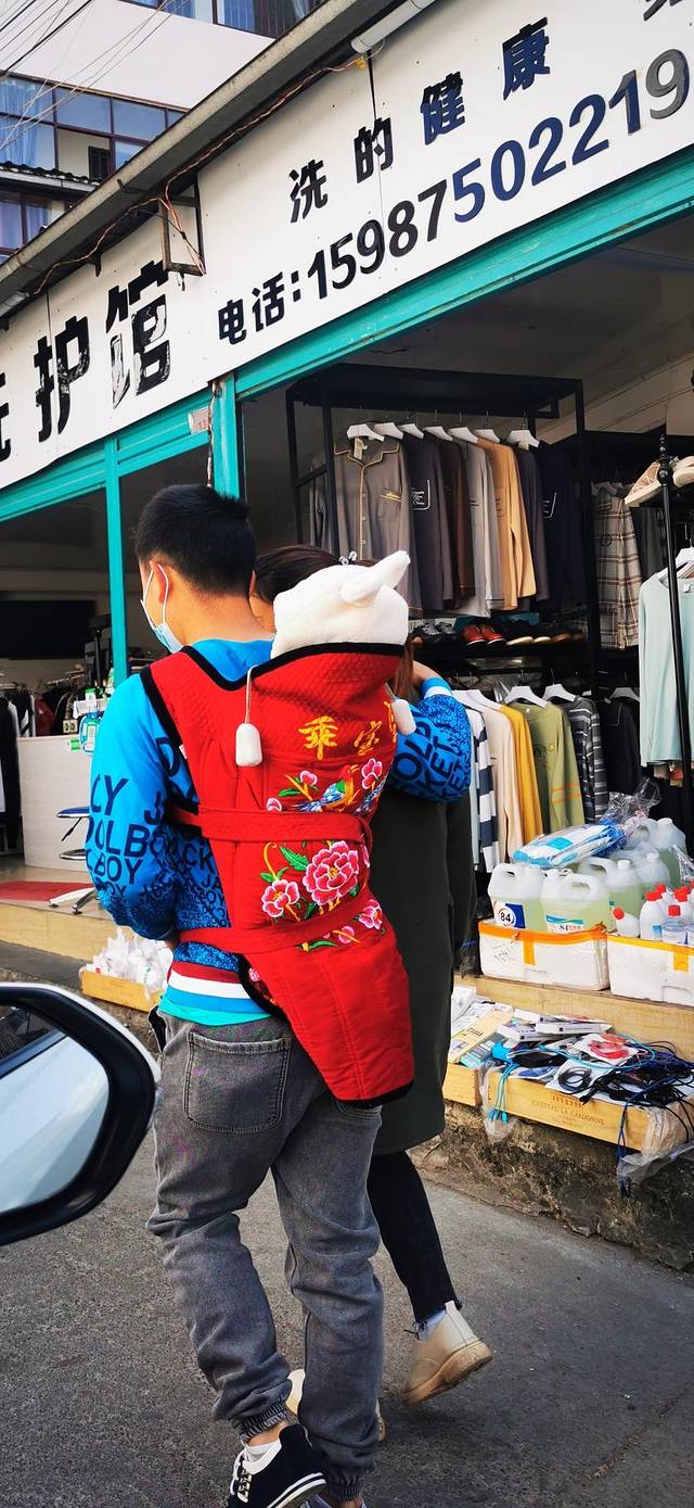 年轻男孩子也是这样背孩子。