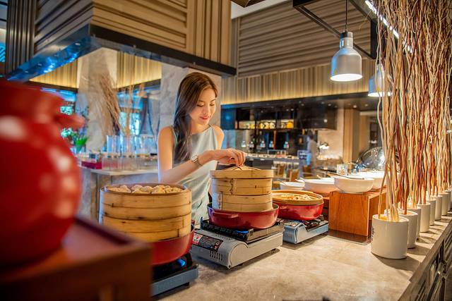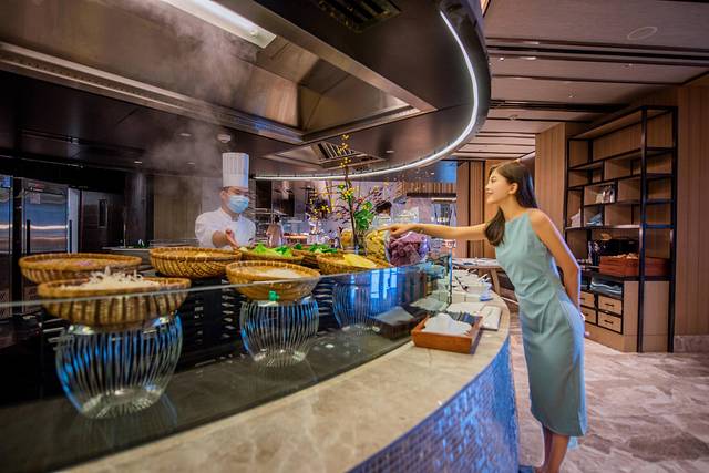 厨师现场烹饪美食,在透明的开放式厨房烹饪,令人更为放心!餐厅菜品丰富,有现烤生蚝、缤纷海鲜、精选热菜等。在这里,牛羊排可以无限畅吃,实现肉食自由。