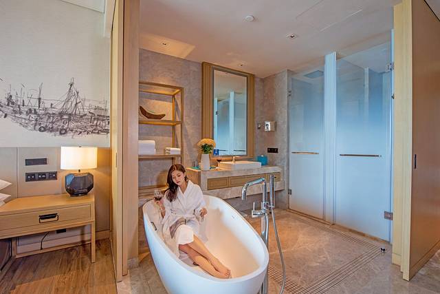 走进酒店大堂,这里的热带植物让我宛如置身“小东南亚”,礼宾员热情接待,将我的行李送到房间。宽敞的大堂悬挂着精致的编织吊灯,闪烁的灯光照耀着前台的船杖装饰,让我仿佛置身于一艘巨大的海上游轮。大堂吧的装修风格很有异国情调,环境优雅,不仅适合午后喝茶,也是拍照打卡的好去处。