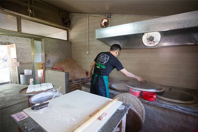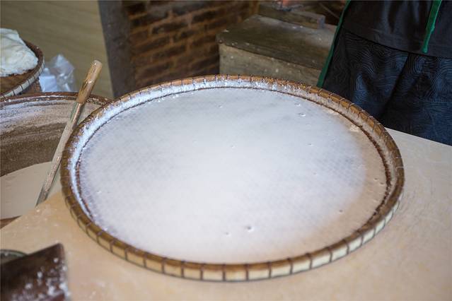 由于来得早,因此我们能欣赏到盖仔粉的制作过程,只见师傅先舀起米浆倒入盖仔中,然后将竹盖放在沸腾的热水上等待粉蒸熟。当再次打开蒸炉,白色的米浆在高温下已经变成一张薄透的米粉。
