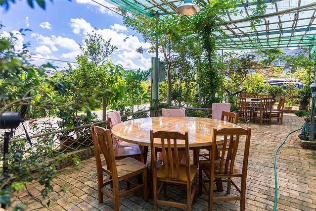 坐在这里吃饭别有一番味道,放眼望去,蓝天、白云、果树相映成辉,宛如一幅美丽乡村画卷。