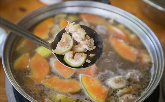 鸡汤吸纳了木瓜的精华与无花果的清甜,鸡肉肉质结实,连皮都是爽的!