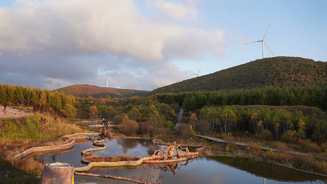 4.天镜湖、五彩池:这里是七彩森林景区里最美的景点。天镜湖不大,但是特别清澈干净。就像一面天空之境,蓝天、白云、山石和森林的倒影和真实风景,傻傻分不清楚,一群白鹅畅游其中。这里夜间还有灯光秀,无论白天黑夜都有极度舒适的视觉体验。五彩池周围布满各色鲜艳的格桑花,金黄色的白桦林、旋转的大风车倒映其中。