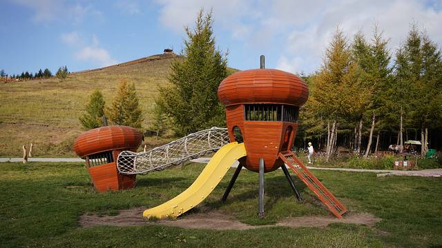 牛奶小站前面夏天是一片花海,在花海里荡秋千,玩跷跷板,骑骑童年的小木马,再配上一块牛奶雪糕,心情简直爽歪歪。秋季一片姹紫嫣红,色彩丰富的山间有各种、各色工程车辆可以打卡。也可以沿着牧道和那些悠闲的马儿、牛儿近距离接触。
