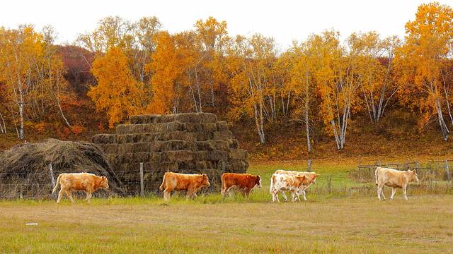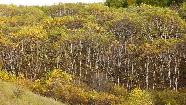 以前拍坝上秋天都是到乌兰布统,看到沿途整齐的落叶松泛着金黄的树叶从眼前掠过,面对这似曾相识的景色,似乎没有太大的兴奋,有了汗苏鲁对比,这边颜色就淡了很多,所以路上没有过多逗留,就进了前往汗苏鲁的穿越路线,那错落的丘陵,蜿蜒如河流般与蓝天白云接壤。寂静的白桦树,稀疏不一地依着山包,星星点点的树木,兀立在草坡上,一条条不规则的车辙镶嵌在草原里,满眼呈现着一片安祥宁静的田园风光,构成的风景如一幅幅织锦令人赞叹不已。那些红屋、蓝房、围栏、牛羊乃至劳作的人们,都成了画卷的点缀之笔,在秋阳的沐浴下,树叶是绿色的、金色的、红色的、橙色的,草地是金色的,天空是悠远的,树林是幽静的。在这如画般的天地里,面对满眼皆美景的境遇,这一片迷人的坝上秋色,怎一个美字了得!