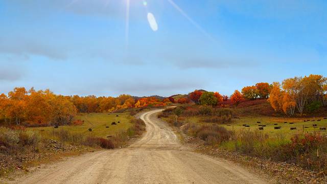 如果想深度体验秋色,感受更丰富的色彩。从七彩森林向东北方向二百公里左右,在乌兰布统草原的深处,万亩欧式草原风光隐于天际,只有老玩家才能找得到。克承高速十一期间应该就能全线贯通,会更快顺达。不过现在的国道和一小段沙土穿越路线,会收获更多的秋色,旅游大巴也能抵达,沿途很多摄影团,“长枪短炮”的架在调色盘一样的风景前。因为要穿过乌兰布统景区,如果没有计划游览乌兰布统的计划想直达赏秋圣地,可以在乌兰布统西门办理过路票,一小时内到乌达售票处办理退款。