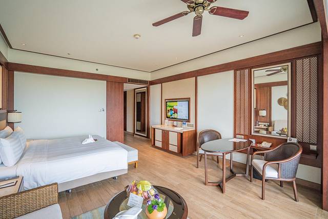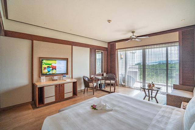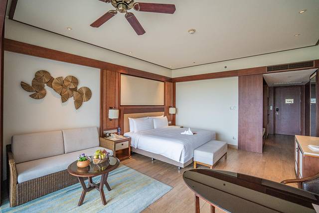 住进64平的豪华阁海景大床房,拉开窗帘就是一望无际的大海。客房装修是非常浓郁的东南亚风情,非常符合三亚海岛度假的气质。大大的阳台,正好可以看到海棠湾的日落。一张特大床,不仅满足两人需求,即使是家庭出游,小朋友睡进来也很宽敞,床品和卫浴用品都是一流的产品。入住豪华阁海景房宾客可享有豪华阁专享礼遇、每日2位成人及2位儿童早餐,畅玩探险乐园。