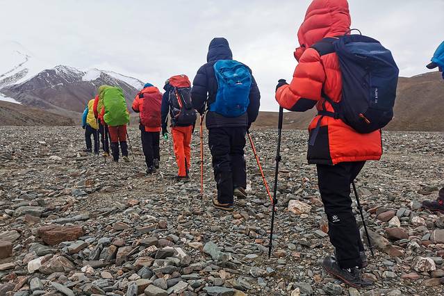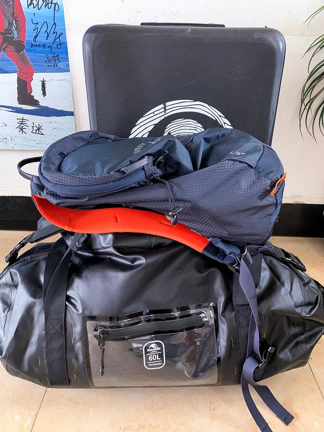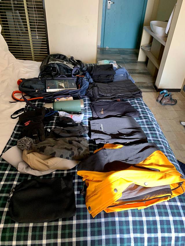吃完早餐后,大家各自回帐收拾装备,1:1协作的队员可以把大部分装备交给向导来背,1:2协作只能自己背或者花1600元雇向导背。我的负重能力不太好,所以把单反留在了大本营,只背了保温水瓶、路餐、GoPro等物品轻装上山,睡袋和不穿的衣服交给华仔来背。