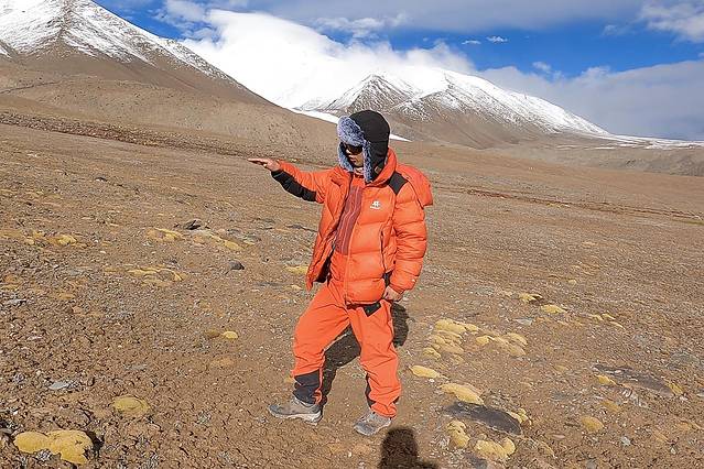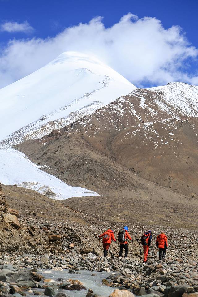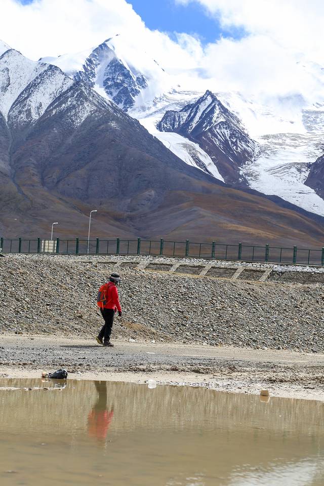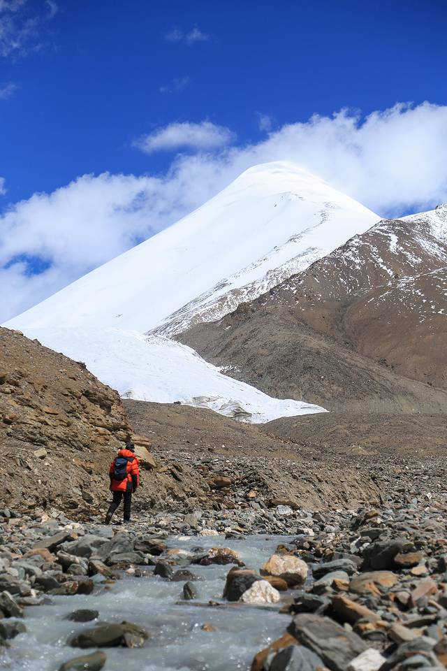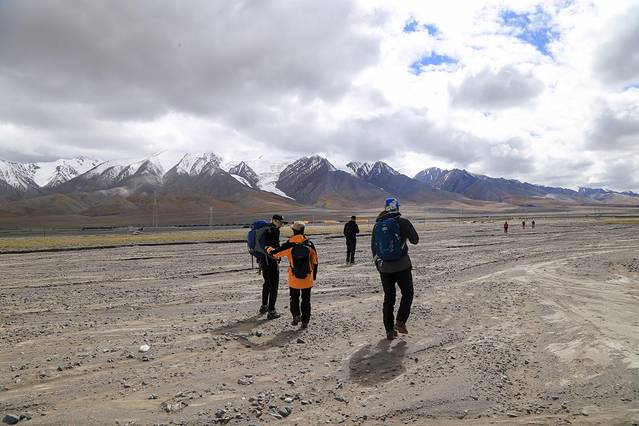 还剩最后几百米路程时,我坐在小河边一步也不想走了,华仔自已一个人在前面大步回了大本营。出发前扣肉说,没有赶上第一趟车回格尔木的队员,要等最后一位队员撤回大本营才能一起走。想到大家还在等我回去,我又咬咬牙起身往前走,走着走着突然看见远处一个橙色衣服的人向我走来,原来是华仔在大本营放下背包后又来接我了,着实有些意外。