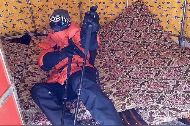 今天早餐后观察了一下大家的状态,东来非常的虚弱,听说昨晚吐的厉害,向导们觉得他可能走不到C1,小川的精气神不太好,老眭在良好的心态下高反已经恢复很多,晓莉姐、老卢、蟑螂轻微高反。我没有高反,在餐厅帐里很欠打的说想体验一下高反的感觉,其他几名队员开玩笑说要群殴我。