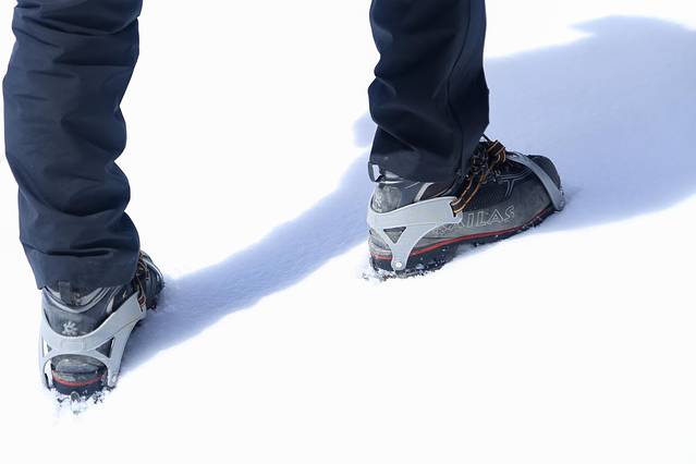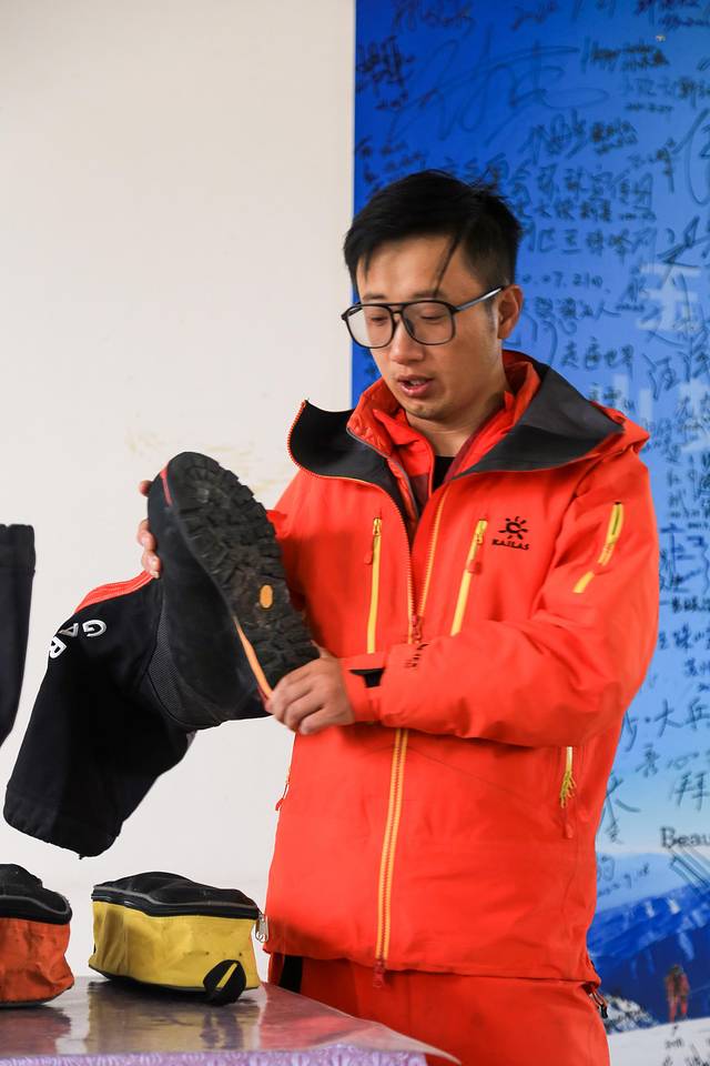 讲解结束后,我找小林买了两双羊毛袜,穿一双有点儿冷,穿两双又感觉脚部被挤压的不太舒服。经过我的反复测试,内层穿羊毛袜、外层穿徒步袜,可以兼顾舒适度与保暖性。之后,大家又分别试穿了高山靴、冰爪、安全带,并反复练习穿冰爪。我对冰爪的使用不是很熟练,蟑螂和向导伟伟对我提供了帮助和指导。