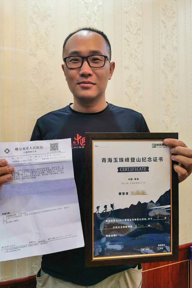 晚上八点,我们在酒店二楼举行庆功宴,扣肉给每位队员发了凯途的攀登证书,青海登协的证书需要等上一个月才能收到。蟑螂在群里看见大家的照片也赶来与证书合影,他左手证书、右手检查报告单的照片,很有戏剧性。