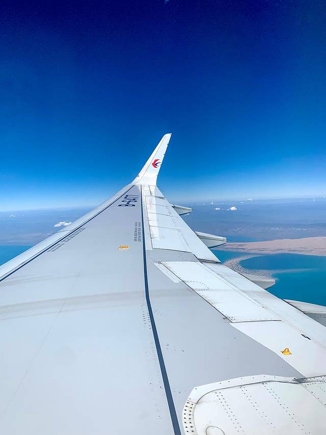 航班提前5分钟起飞,提前14分钟到达,小机场就是好啊。起飞后不久,我从窗外看到了澄蓝的高原湖泊。才欣赏了一小会儿风景,飞机就即将进入下降阶段,乘务员通知大家关闭了遮光板。格尔木是军民两用机场,不能随意拍摄。