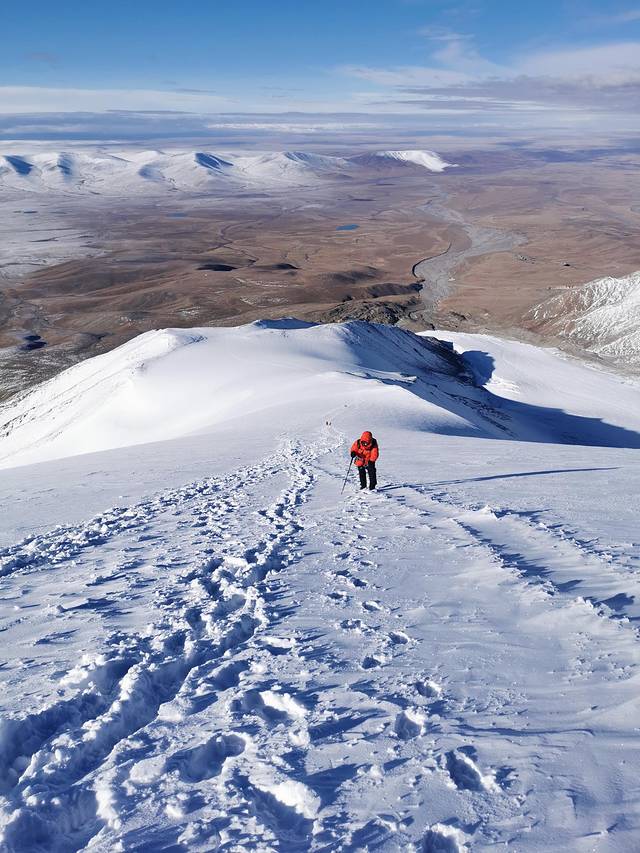 早上9点47分,我一鼓作气走到了海拔6178米的峰顶,除了累没有太多其他的情绪,这时我的水瓶里已经没有水了,华仔给我拍了几张登顶照后,我们就迅速下撤了。