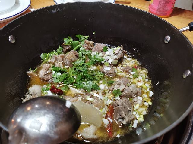 在枣园一公里左右有一家铁锅炖,简直羊肉太香就把,我们点了二斤肉的,一定要涮白菜萝卜和面,最后吃的羊汤面,性价比很高,人均60左右