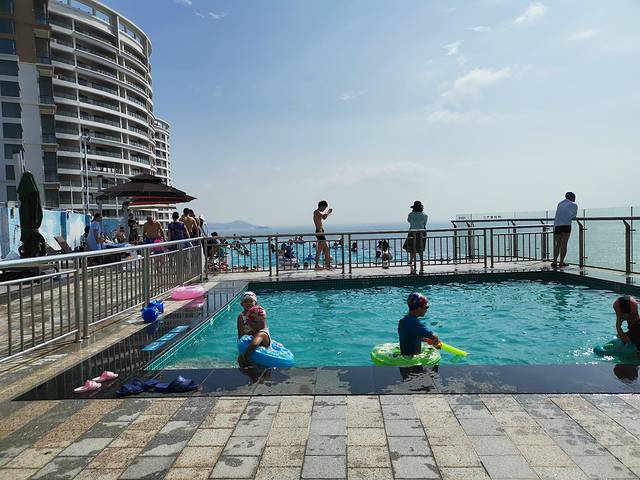 酒店能免费不限次数和人数进出水上儿童乐园,里面还有几个小小的温泉池,这对于小盆友来说,足够玩了。水上儿童乐园门口有保安,要看房卡,才放行的。如果住公寓,不确定要不要收费。另外,酒店14楼有无边际游泳池,一个房间一天共有两次(两个大人)进出的数量(数量有点少)。进入前需要拿房卡登记,如果不游泳,帮忙拍照的,不要拿房卡给门口的工作人员,不然也会扣次数。进入泳池要戴泳帽。游泳池的水挺凉的,下水前要做好热身(我们试过14点上去游,本以为会被太阳晒热些,但水依旧那么凉,不过这个时间段,人特别少,使用感很好)。