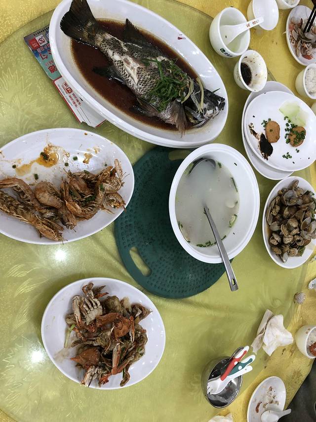 选择锐记美食,主要是美团上有一个四人套餐,还挺优惠的,但是我们没有提前买,到店后它就下架了,于是就买了一个6人套餐,太多了,感觉一下子就把几天的海鲜都吃完了…