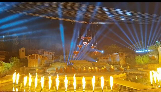 这个阿惹妞就在火把广场,它实际上是大型舞台剧,分为五章,分别是鹰山水火年,场景非常宏大,只有周末和法定节假日才有表演。根据坐席的位置,票价不一样,和成都琴台路的蜀风雅韵票非常类似,分VIP、甲1、甲2等。我们通过岷山饭店订的甲1票,门市价一张380,饭店预订一张优惠76元,1.2m以上小朋友全票。