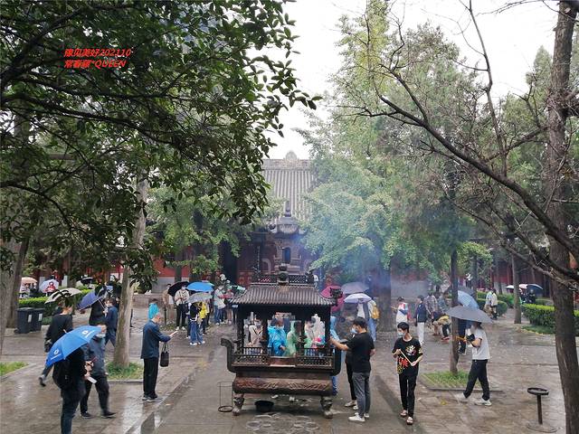 这是一座长方形的寺院,红墙黛瓦,古色古香,尤有齐云塔的映衬,更显得庄严古朴。寺内,主要有天王殿、大佛殿、接引殿、毗卢阁等四大殿堂。白马寺的几重大殿前青烟缭绕,信男信女脚踏莲花石板地面,焚香、叩头、拜佛,熙熙攘攘,络绎不绝。尽管下着小雨,依然没有阻挡人们礼拜的热情。。。