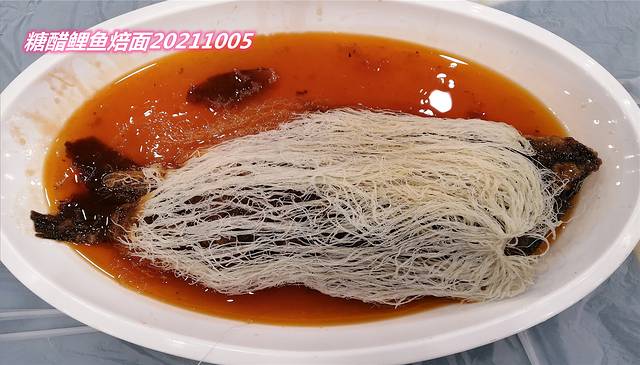 经典的糖醋鲤鱼醅面,第一次看到第一次吃。鲤鱼焙面是“糖醋软溜鱼焙面”的简称,该菜品是河南省开封市的一道传统特色名菜,也是“豫菜十大名菜之一”。来开封旅游不品尝一下糖醋软溜鱼焙面,那是一件非常遗憾的事。糖醋软溜鱼焙面是由糖醋熘鱼和焙面两道名菜配制而成。焙面也称龙须面,整条的鲤鱼平放在硕大的鱼盘里,盘里浓浓的汤汁。我是非常喜欢鱼,夹起酥酥的面蘸上酸甜的汤汁,选一块厚厚的肉肉来吃,酸甜鲜美,焙面酥脆,确实挺好吃的,只是量太大,二人吃有点浪费。