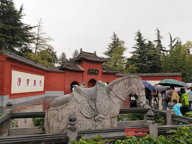 在白马寺山门前,有石马石像,两匹石马,左右相对,使人一望便会想起“白马驮经”的故事,事实上,初来乍到的游客都把它想象为汉代驮经的白马。其实不然,我们眼前的两匹石马是北宋永庆公主驸马“太师太保、右卫将军、驸马都尉”魏咸信墓前的神道石刻马,1935年德浩法师住持白马寺,将石马迁置于山门前。标志性的寺门前,游客驻足争相拍照留影。 听说以前可能没设栏杆,马身上被摸的油光,如今有栏杆了,游人只能倚着栏杆照相了。