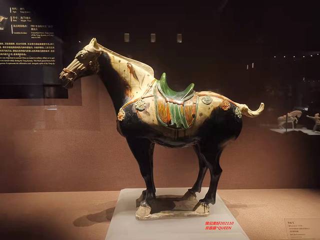 洛阳博物馆珍藏的这件唐三彩黑釉马,高73、长84厘米,四足挺立,头颈上昂,眼视前方。全身黑色,唯马面、鬃、背、尾、蹄为白色,间施酱黄色花斑,马鞍鞯为绿、黄、白三色相间,背垫褐色釉的革带为饰,革带系绿色或棕色的圆形骑马浮雕垂饰15枚。
