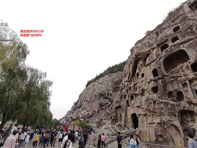今天的游客很多,是我这二年来长假外出游客最拥挤的一个景区。还好,景区防疫防护安全措施很到位,工作人员很多,随时疏通游客保持距离。洞窟依山而凿,大大小小的洞窟数不胜数,龙门全山造像11万余尊,最大的佛像卢舍那大佛,通高17.14米,头高4米,耳长1.9米;最小的佛像在莲花洞中,每个只有2厘米,称为微雕。