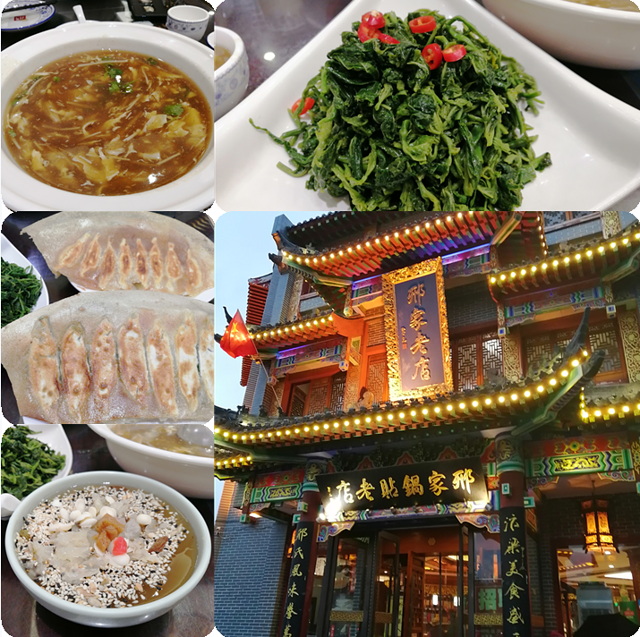 整个下午在酒店里喝茶看剧,很愉快的度假哦。晚餐搜到了附近的美食:邢家锅贴。出酒店左转步行约400米。古香古色的高大门头,很是气派!大堂灯火辉煌,已有不少客人。服务员态度很和气,热情推荐食谱。初次到来,首点特色锅贴,必点啊!大肉韭黄和什锦锅贴,看那金黄色的锅底焦面,酥脆。馅料香而不腻。凉菜:巧拌桑叶苗,第一次食用,非常好吃。甜品:杏仁茶,在洛阳没品尝,今儿个非得尝尝,我感觉就是藕粉调制的,回到家里也做过,纯正的杏仁粉根本调不出这软糯的透明汤料。二个人点菜真的是不好点,一个少了二个多了,来个汤:开封三狠汤,名字很霸气,其实就是酸辣汤,哈哈,不过味道是真的非常好,是我喝过的最好的酸辣汤。二个人尽了全力,还是浪费了一些。吃的太饱,出门右转沿着内顺城路往清明上河园散步消食。