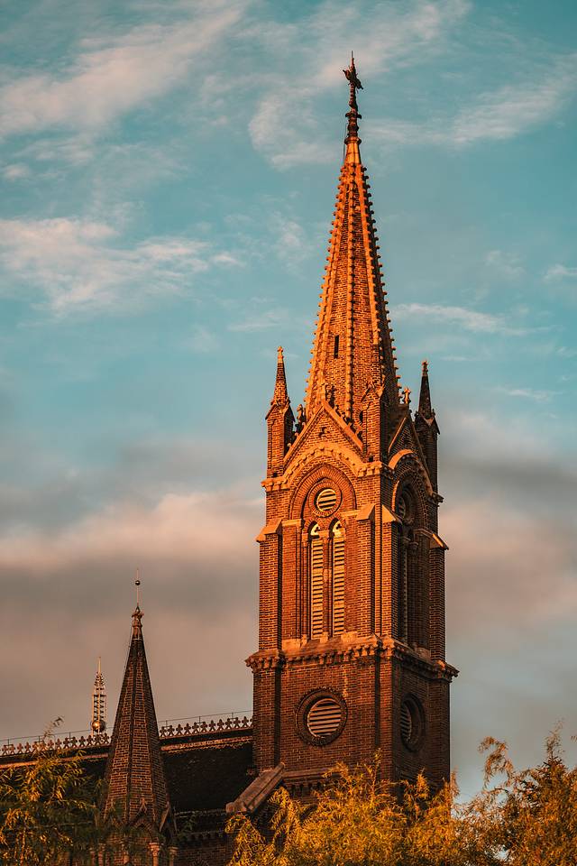 落日时分站在吉林大桥的一侧,抬头可以看见教堂的塔尖被余晖铺满。