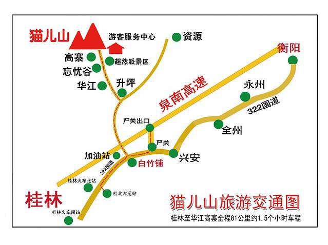 桂林后取道322国道北上至兴安县境内的车田转入往资源县的省道北上21公里至升坪后再转入往猫儿山(高寨)的小路便可抵,自驾也只能到山脚哦,不允许开车上山。
