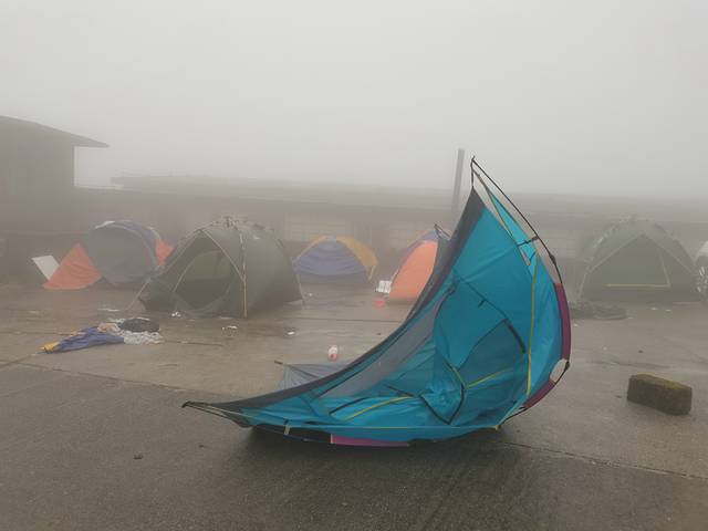 匆匆忙忙搭好帐篷,赶上山,只有大雾大风┭┮﹏┭┮,以及最后一抹霞光,哇的一声,想哭·······